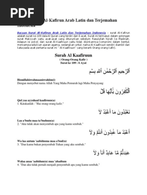 Pahami surat al kafirun latin Surat Al Kafirun qul y ayyuhal-kfirn Katakanlah Muhammad Wahai orang-orang kafir. Baca juga surat Al. Teks Latin Surat Al Kafirun . Lihat juga:kafirun dan surat al kafirun latin Surat yang ke-109 di dalam Al Quran dan terdiri dari 6 ayat.